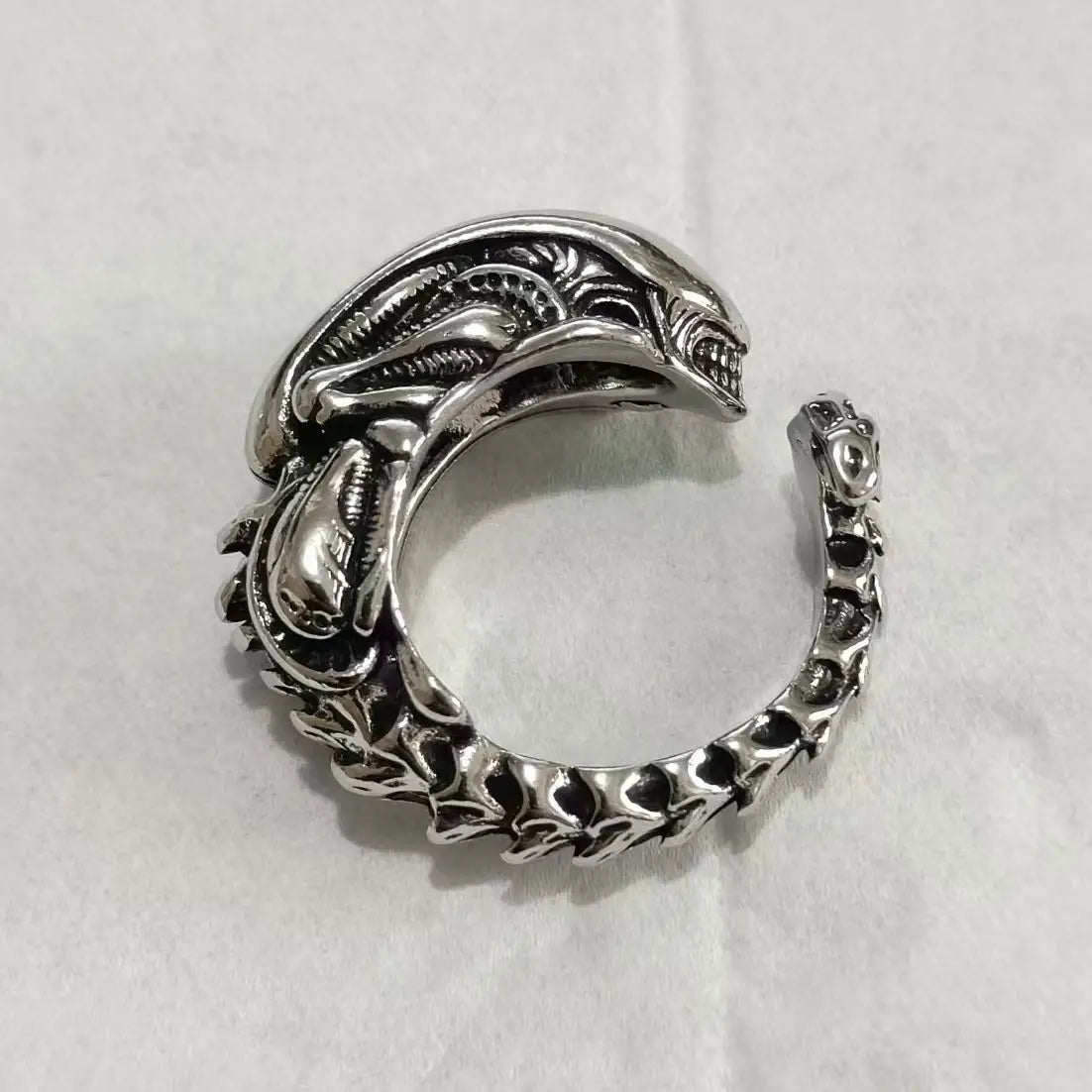 La bague arbore un motif animalier/alien qui évoque mystère, futurisme et imagination. Sa surface argentée, réalisée en alliage de zinc, lui confère un éclat subtil mais durable, tandis que sa finition soignée assure une qualité visuelle qui attire le regard. Le style punk de cette bague s’inspire des tendances actuelles de la mode masculine, tout en restant intemporel, permettant à son porteur de l’associer aussi bien à une tenue décontractée qu’à un look plus sophistiqué.